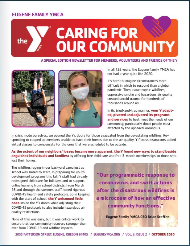 The Eugene Family YMCA has a long history of prevailing in difficult times. 2020 is no different. Take a look inside this Special Edition newsletter to discover how the Y has reinvented its programs and services in response to a global pandemic, catastrophic wildfires and our community's needs.