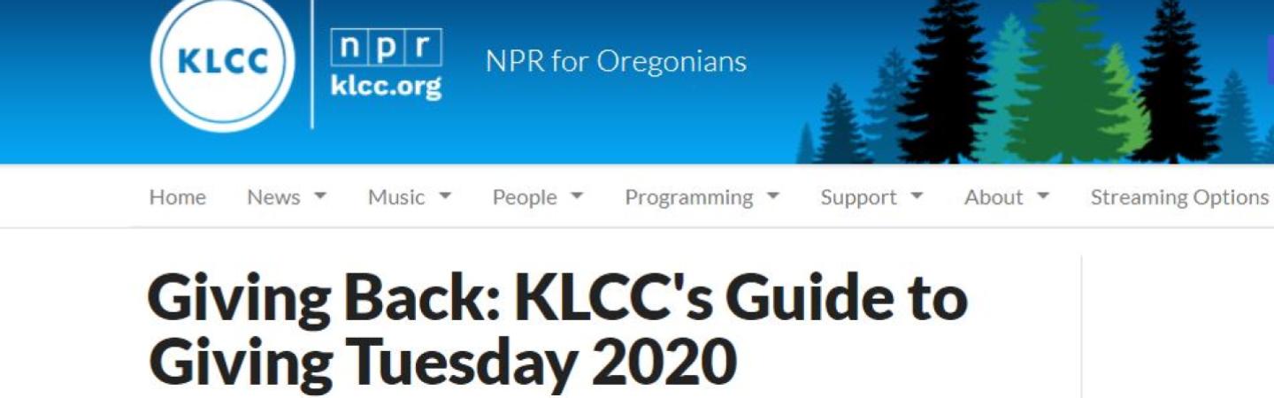 Giving Tuesday is a global generosity movement unleashing the power of people and organizations to transform their communities and the world. Listen HERE to the special broadcast: Giving Back: KLCC's Guide to GivingTuesday.